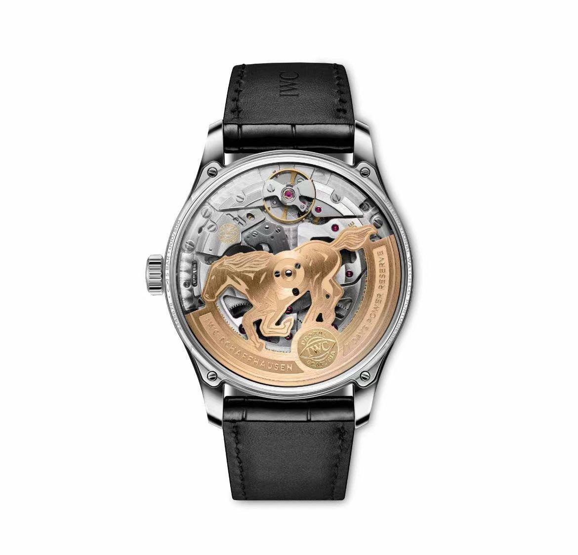 然而,这枚手表实正的诗意,躲藏正在透过蓝宝石玻璃表背方可窥见的机芯世界中。那里跳动着的,是靠得住的IWC万国表便宜52011型机芯。其高效的比勒顿 (Pellaton) 从动上链系统,以近乎无磨损的陶瓷部件,为双发条盒源不竭地积储长达168小时的惊人能量 。 但实正的点睛之笔,是那枚为一匹飞跃骏马的镀金摆陀 。 每一次手腕的轻细摆动,都驱使着这匹机械骏马奋蹄疾驰,将无形的动能为无形的光阴。正在此,我们所见的已非冰凉的零件,而是一则陈旧传说的机械心跳。