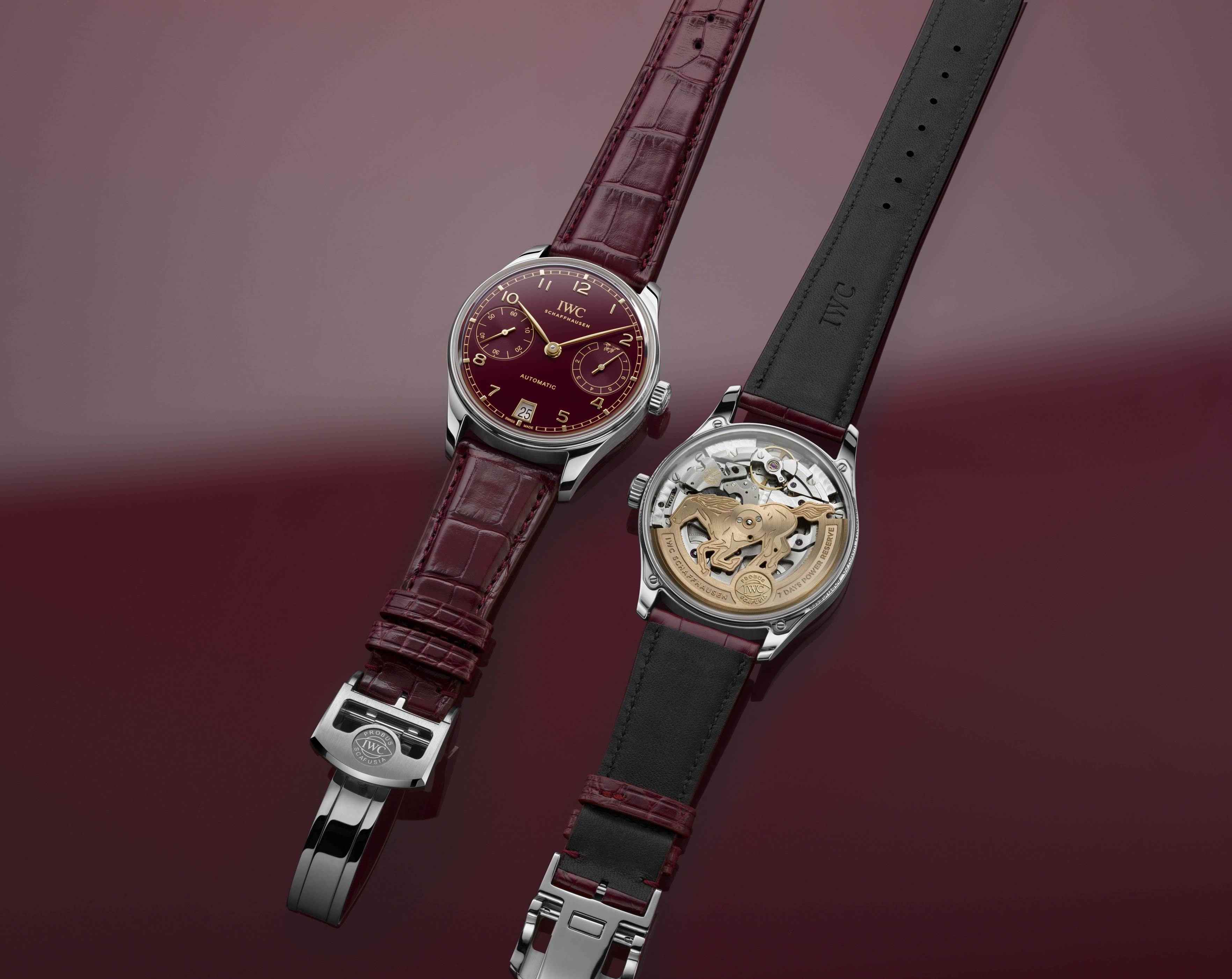 此枚手表(型号IW501709)的不凡之处,始于其一见难忘的勃艮第红色表盘。它并非节庆中宣扬夸张的正红,而是一种沉淀了岁月光泽的醇厚色调,好像陈年佳酿,正在光线淌着内敛而崇高的气味。 正在这方寸舞台上,葡萄牙系列典范的平衡结构得以保留:9点钟的小秒盘取3点钟的七日动力储蓄显示遥相呼应,配合守护着时间的协调次序 。 一枚伟大的时计从不纯真计较时间,它付与时间以分量和质感。金色指针取镶贴时标划过这片艰深的红,好像阳光擦过奔马的鬃毛,每一次读时,都是一次文雅的审视。