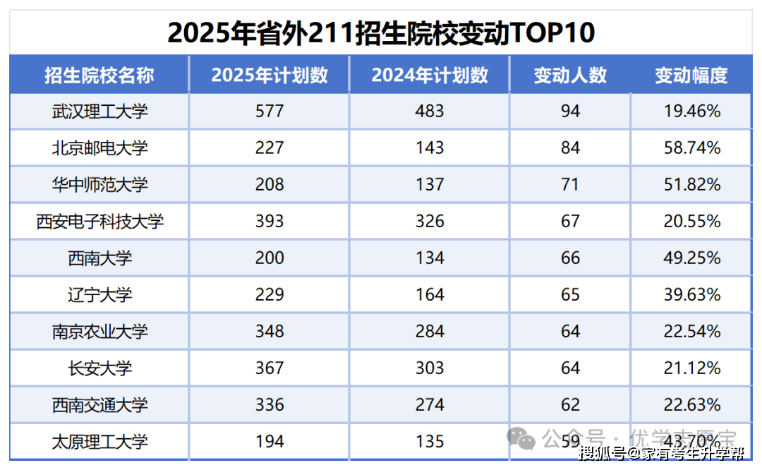 变更幅度前三名别离是邮电大学、华中师范大学、西南大学,增幅别离为58。74%、51。82%、49。25%。增幅跨越40%的还有太道理工大学,增幅为43。70%。