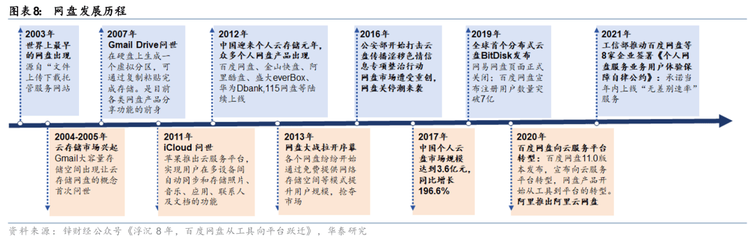 保守数据存储体例,成长过程近70年。硬盘存储始于1956年,彼时IBM推出了世界第一款机械硬盘(HDD)IBM 350 RAMAC,其时硬盘体积大,容量仅5MB。此后机械硬盘不竭成长,容量逐步增大。1989年,固态硬盘(SSD)呈现,其采用固态电子存储芯片阵列,相对于机械硬盘读写速度更快,逐步使用于专业范畴并市场化。此外,跟着手艺前进,外挂储存模式呈现,人们得以通过添加硬盘扩展存储容量。硬盘存储模式下,所无数据都留存于当地,私密性高。但硬盘每次仅办事于单个办事器,未便于数据传输和多端拜候,越来越无法满脚消息爆炸时代人们共享协做的需求,矫捷性低且不易扩展,还存正在着硬盘损坏或丢失形成的平安现患。