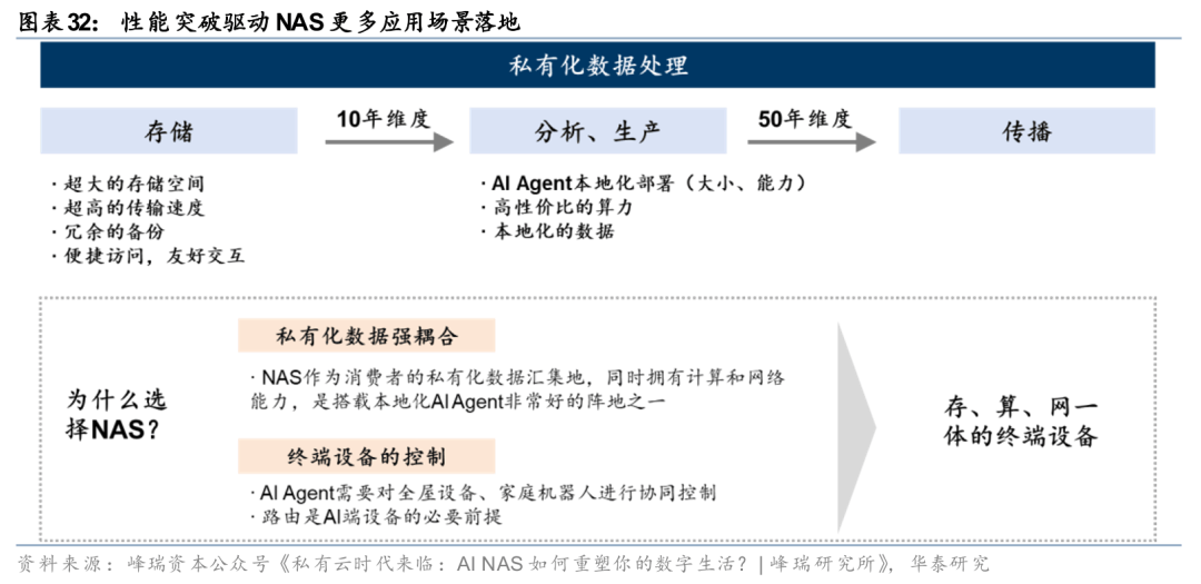 跟着小我数据量激增,以及用户对数据拜候立即性、平安性的要求越来越高,NAS(又称私有云存储)正加快破圈,从小众极客品类更多消费者视野。据久谦数据,25Q1-3境内线%。通过汗青复盘,我们认为当前消费级NAS无望送来需求加快渗入,焦点逻辑有二:1)NAS从3000-4000元迈入“千元机”,帮推需求放量,据我们测算,2026-2030年全球消费级NAS市场规模CAGR或超30%;2)AI取NAS的双向赋能,NAS为AI供给平安的数据底座,AI下的NAS无望进一步拓宽使用场景(如AI当地化摆设、智能家居系统、视频内容出产力东西),破圈增加可期。