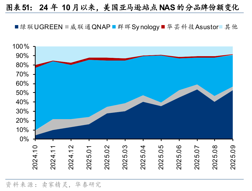境外市场:群晖占领用户,绿联正在美国表示亮眼。群晖正在境外市场份额相对领先,但自4Q24绿联NAS产物上线美国和亚马逊以来,市场份额快速提拔,按照卖家精灵数据,美国/亚马逊坐点上,绿联的市场份额别离从25Q1的24。4%/4。9%逐季提拔至25Q3的49。9%/11。2%,而群晖期间份额别离从53。0%/66。5%回落至33。8%/59。4%,三季度绿联正在美国亚马逊坐点的份额超越群晖成为行业第一(市场份额按照发卖额口径计较)。