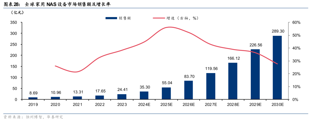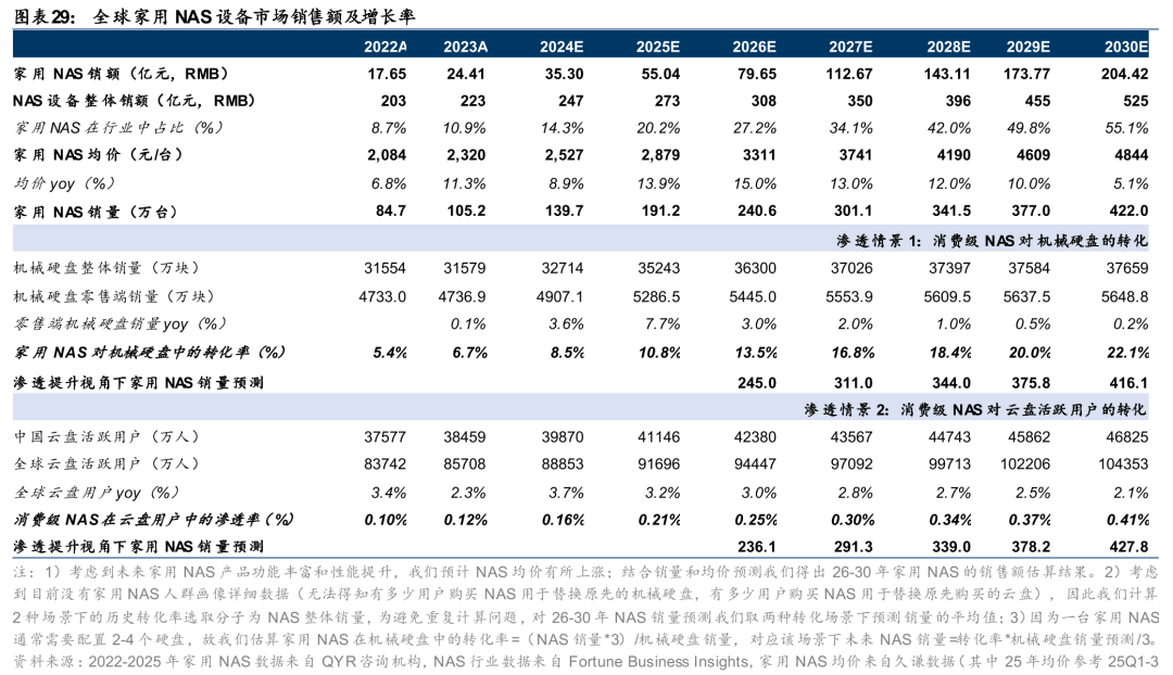 消费级NAS市场:1)第三方数据:按照QYR(恒州博智)的统计及预测,2023年全球家用NAS设备市场发卖额达到了24。4亿元,估计2030年将达到289。3亿元,2024-2030年复合增加率为41。99%。此中中国市场2023年家用NAS市场规模为7。12亿元,占全球的29。19%,估计2030年将达到96。19亿元,全球占比将达到33。25%。2)基于视角的测算:我们认为NAS做为存储空间+小型办事器,将来做为更高效的数据存储和办理核心,将对机械硬盘和公有云两类存储体例进行必然替代和。因而,我们按照汗青的家用NAS发卖额及均价数据,计较家用NAS销量(24年估量全球出货量140万台),参考ToC的机械硬盘销量和云盘活跃用户数,计较NAS对硬盘/云盘的汗青率;再基于将来率提拔逻辑预测全球家用NAS销量和发卖额。按照测算,我们估计消费级NAS市场规模无望从2025年的55。0亿元增加至2030年的204。4亿元,期间CAGR为30。1%,低于QYR的预测。