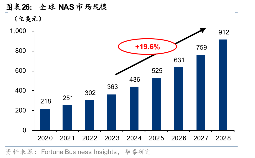 NAS行业全体:按照Fortune Business Insights的数据,2023年全球NAS市场规模达到363亿美元,估计2028年将达到912亿美元,期间CAGR+20。2%。中大型企业用户需求占NAS市场约60%,中国地域出产厂商如群晖、威联通QNAP等占领了大部门市场份额;别的40%的市场次要由C端消费者和中小型工做室贡献,这部门市场相对分离,而且需求不克不及被当下的NAS产物所完全满脚,驱动NAS市场降生新的机遇。中国市场方面,2020年NAS市场规模为43亿元人平易近币,2021/2022年中国NAS规模别离同比+65%/+68%至71/119亿元人平易近币。