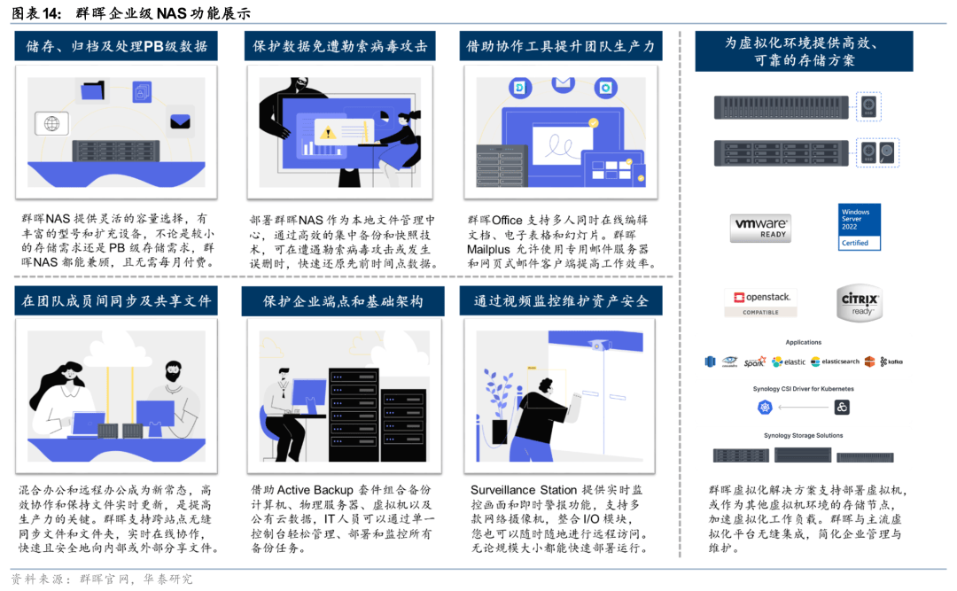 群晖:2000年成立,通过立异软硬件处理方案处理数据办理取平安问题、帮力用户获劣势。2004年推出首款整合硬件和软件的NAS产物DiskStation DS-101。其产物线丰硕,包罗桌面型号的DiskStation、全闪存型号的FlashStation 和机架式型号的RackStation等,可满脚家庭、中小企业和大型企业等分歧用户的需求。按照公司官网2023年9月发布的《处理方案指南2023年》,群晖已交付超1000万台系统,存储数据超70EB,为逾67万家组织供给端点取SaaS数据办事。群晖的操做系统DiskStation Manager(DSM)是网页界面的曲觉式操做系统,功能丰硕、可扩展性强等特点,深受用户喜爱。