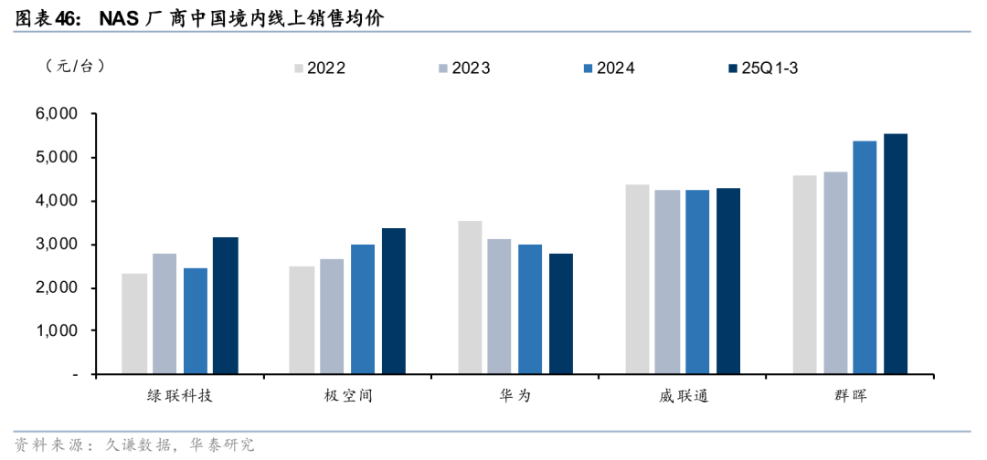 订价:老牌ToB厂商定位高端,消费级NAS品牌打制性价比劣势。按照久谦数据,三大阵营的价钱策略取其焦点客群定位相吻合,此中以群晖和威联通为代表的老牌To B厂商凭仗其深挚的手艺积淀取面向企业级市场的完整处理方案,建立了坚忍的价钱壁垒,其均价远高于其他阵营,群晖的均价从2022年的4554元逐年增加至25Q1-3的5521元,威联通产物均价不变正在4200元以上;而以绿联和极空间为代表的原生C端品牌订价更低(25Q1-3绿联/极空间NAS产物均价别离为3165/3342元),对比老牌ToB品牌更具性价比,这精准契合了其面向家庭取小我用户的市场策略,从而正在消费级市场中占领了相对较优的合作地位。