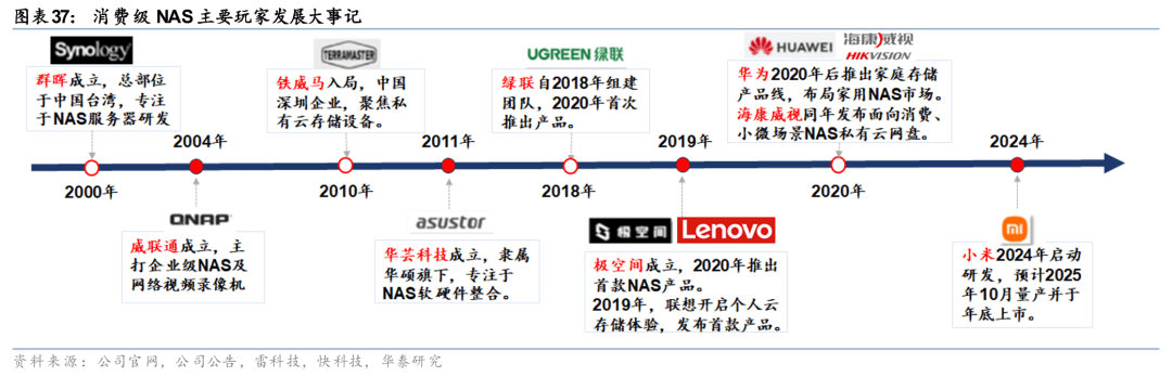 NAS从“专业企业级”向“公共消费级”渗入,参取从体持续扩容。2000岁首年月,NAS行业由群晖、威联通厂商引领,专注于企业级NAS产物,用于企业存储和其他专业使用;后来铁威马、华芸科技等厂商插手,逐步完美存储设备软件手艺并对NAS软件、硬件整合,为家用消费级NAS成长打下根本。2018 年以来,绿联、极空间等消费级品牌兴起,从打小我和家庭云存储,沉视产物易用性和高效性, NAS起头向公共普及。2020年以来,华为、海康威视、联想等大厂接踵入局消费级NAS市场,小米也正在 2024年启动研发,公司估计产物将于2025年10月量产并正在岁尾上市(小米生态链总司理陈波正在2025/6/10抖音曲播透露),参取玩家丰硕鞭策消费级 NAS 产物市场快速增加。