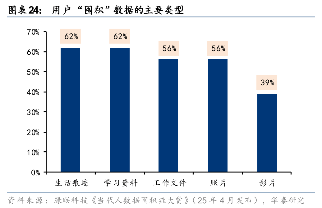 从用户形成来看,“数据囤积症用户”次要集中正在19-45岁春秋段。按照绿联调研成果,存正在“数据囤积症”用户春秋分布为:19-25岁、25-36岁、36-45岁人群别离占比28%、33%和25%。正在身份脚色上以上班族为从,占比48%,学生群体和内容创做者别离为22%和12%。其存储内容以糊口踪迹、进修材料和工做文件为从,比例别离达到62%、62%和56%,数据需求高度贴合日常进修、工做取糊口场景。